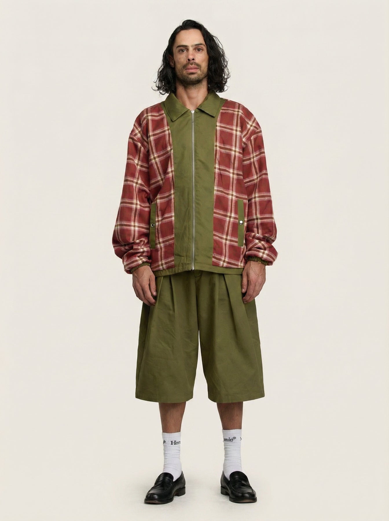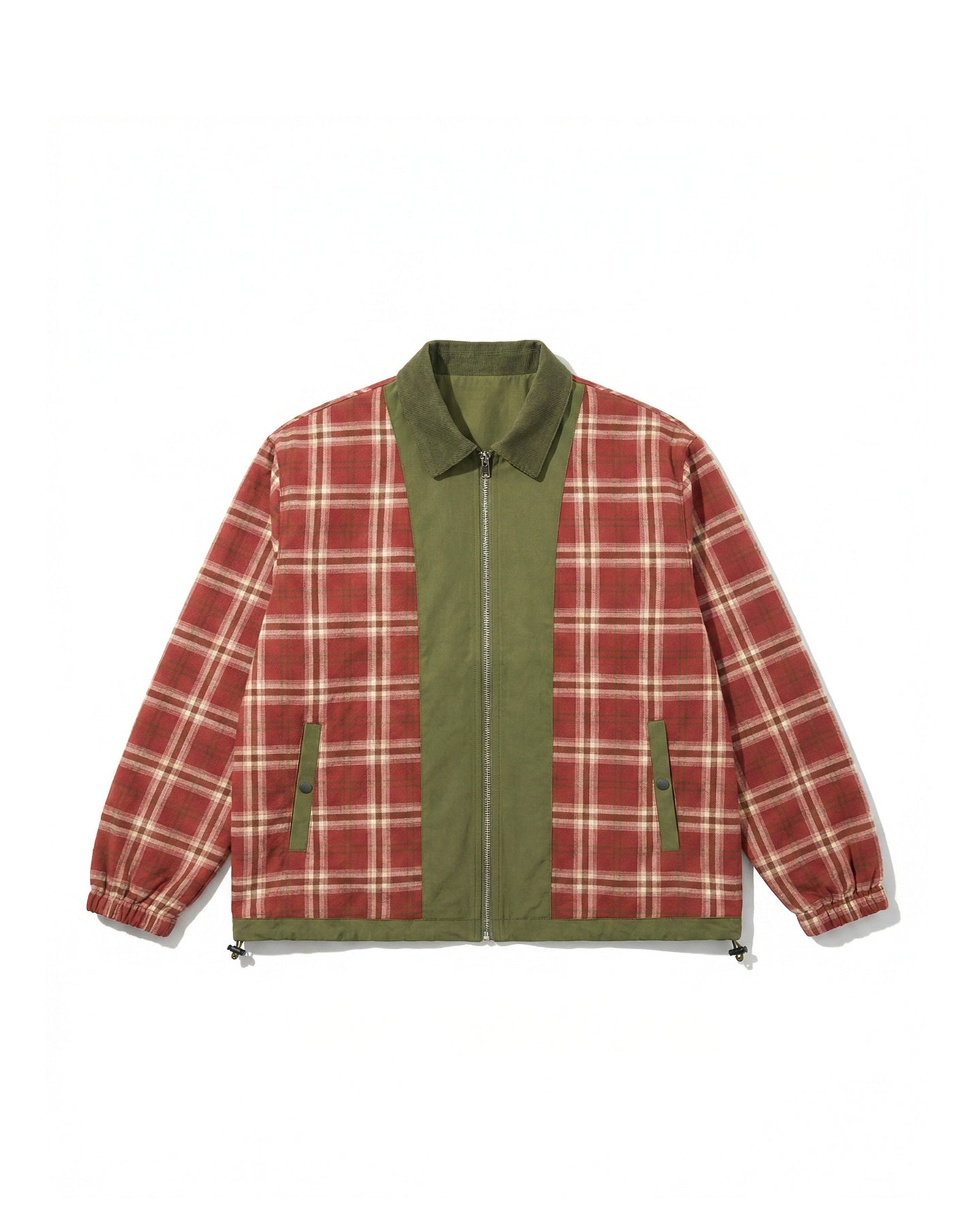 The Personal Growth Jacket in Khaki is a versatile outer layer designed with function and detail in mind. Made with a 100% cotton shell fabric and a lining made from 40% rayon and 60% polyester, this reversible jacket gives you two looks in one, featuring a clean khaki outer and tartan reverse side. It is finished with a corduroy collar, ribbed cuffs, hem drawstrings and a double-ended zipper for added comfort and flexibility. Thoughtful details like the pull-out neck tag and tone-on-tone embroidery on the left and right chest add a subtle premium edge, making it an easy go-to for everyday layering.