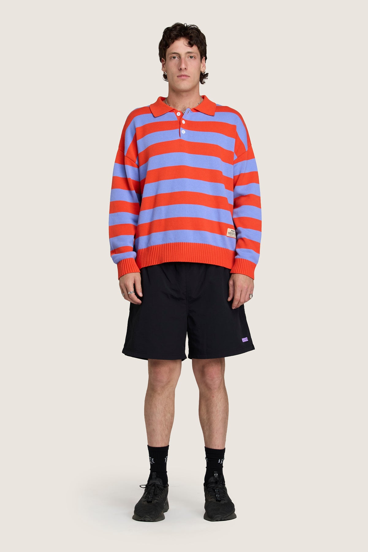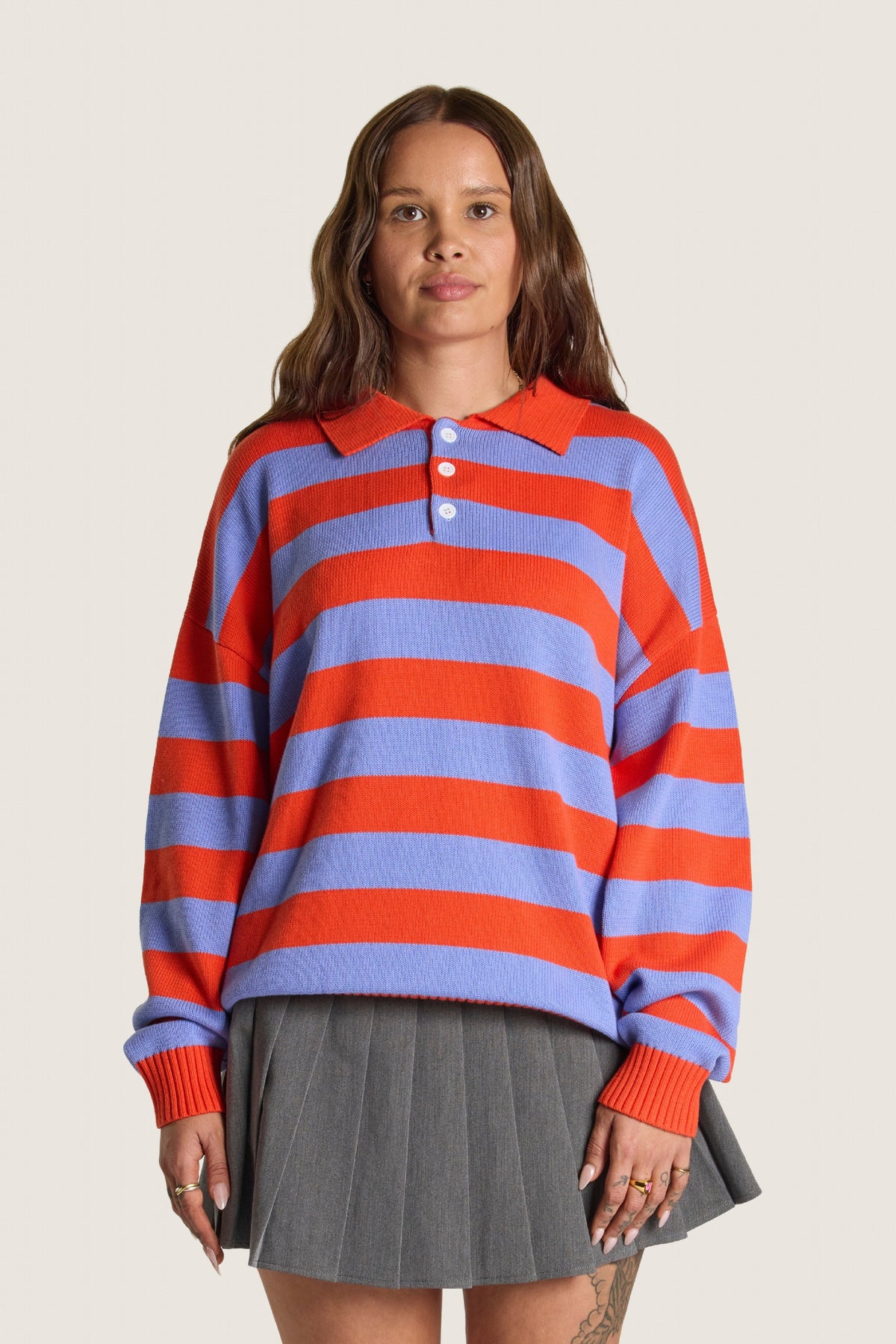 The Knitted Rugby is a fully fashioned jacquard knit made for layerable comfort. With a dropped shoulder, ribbed cuffs and a button up collar. Available in two colours.