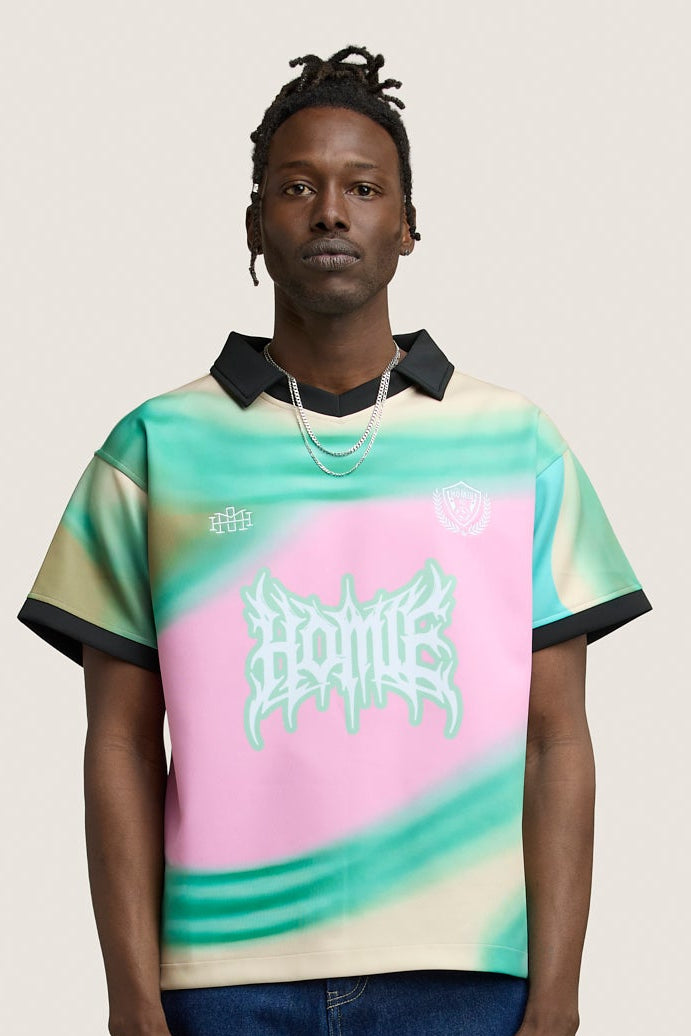 Part of oTHE GETAWAY EDIT collection, the Neighbourhood Jersey in hazy bubblegum is 100% Polyester sublimate printed with a collar and V opening.