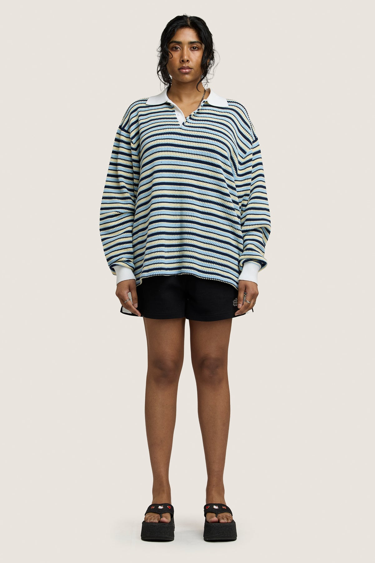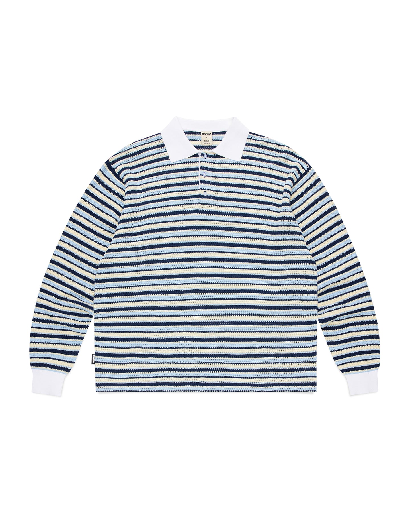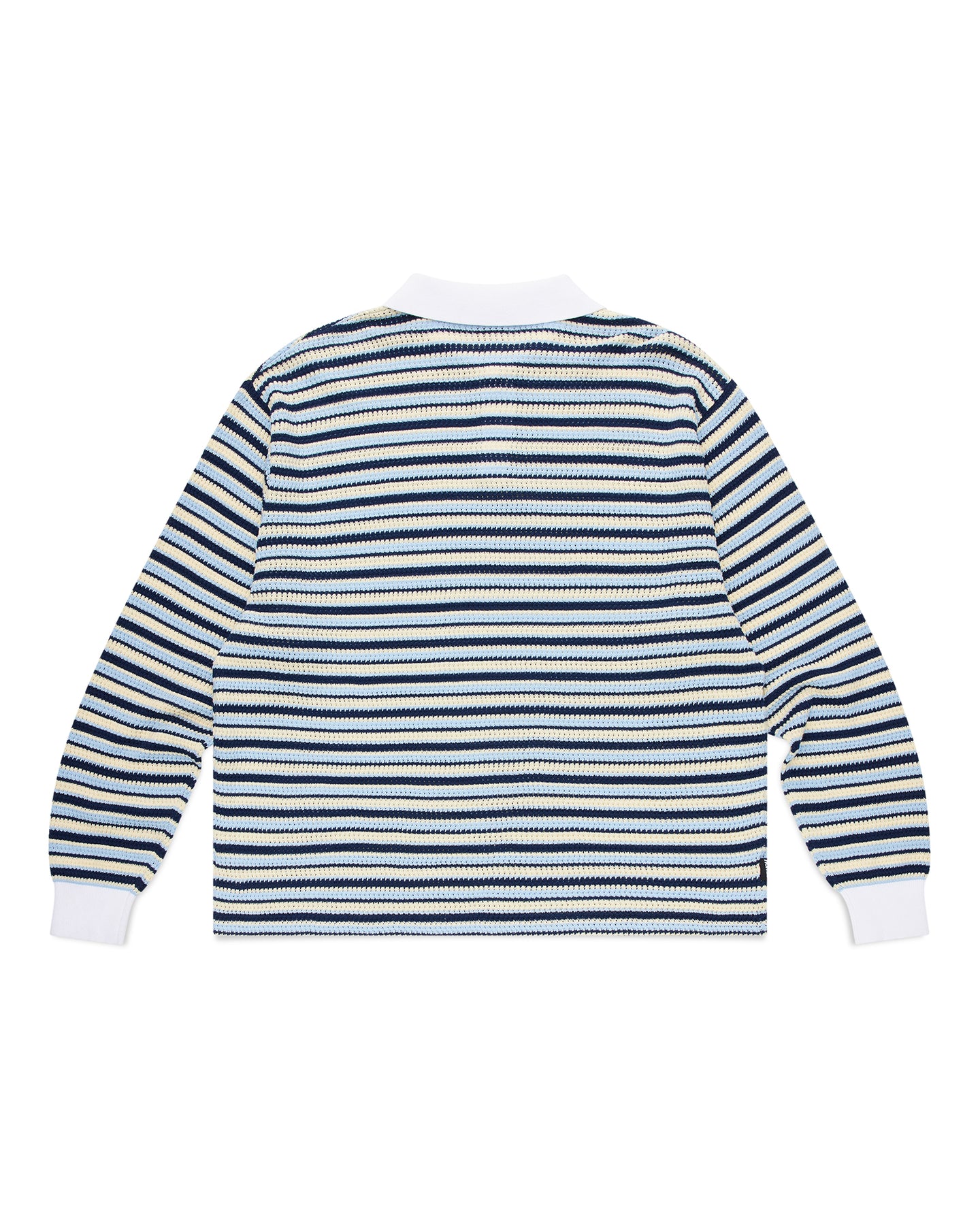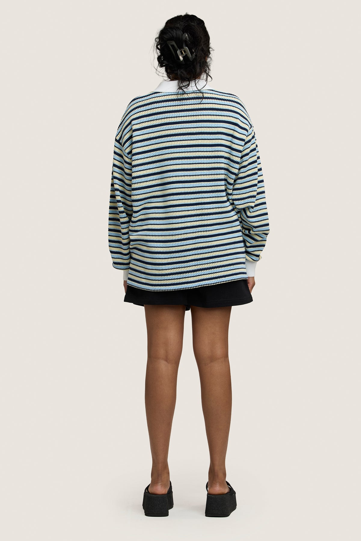 The vintage-inspired Stripe Rugby Knit is a fully fashioned knit with a dropped shoulder, ribbed cuffs and a button up collar.